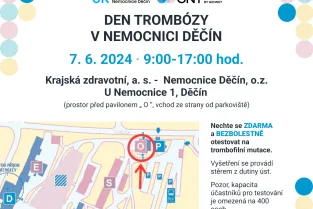 Využijte Dne trombózy v Nemocnici Děčín a dorazte k nám 7. června v čase 9:00-17:00 hodin na adresu Nemocnice Děčín, U Nemocnice 1, Děčín a nechte se ZDARMA a BEZBOLESTNĚ otestovat.